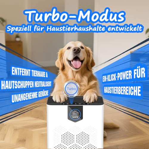 【Turbo-Modus für Haustierhaushalte】Mit nur einem Tastendruck sorgt der Turbomodus für maximale Luftzirkulation – speziell entwickelt zur schnellen Entfernung von Tierhaaren, Hautschuppen und Tiergerüchen. In Kombination mit der starken Filterleistung wird die Luft in kürzester Zeit spürbar frischer – perfekt nach dem Spielen oder Reinigen