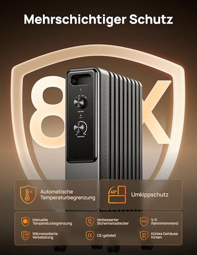 𝙎𝙤𝙧𝙜𝙚𝙣𝙛𝙧𝙚𝙞𝙚 𝙒ä𝙧𝙢𝙚: Mit 8 Sicherheitsfunktionen wie automatischer Temperaturbegrenzung, Kippschutz-Abschaltung und V-0 flammhemmendem Material bietet dieser CE-zertifizierte DREO Öl-Radiator volle Sicherheit und unbeschwerten Komfort.
