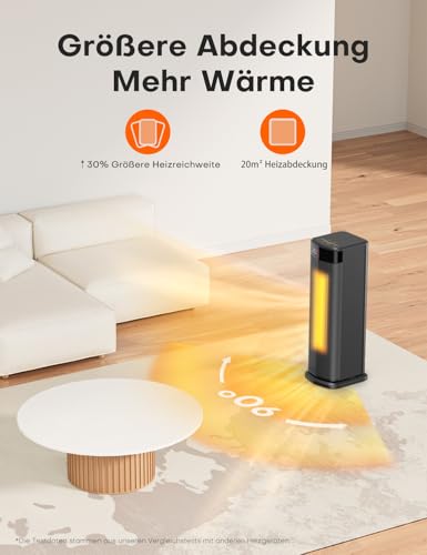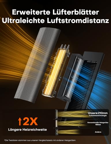 Erweiterte Heizabdeckung: Der heizlüfter energiesparend verbreitet Wärme in jedem Raumwinkel mit Einem leistungsstarken Motor, moderner Ventilatortechnologie und einer 90°-Schwenkfunktion, die die Heizreichweite um 30 % vergrößert