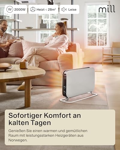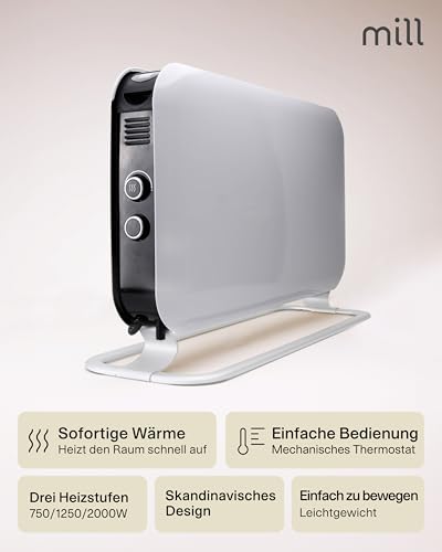 Mill Elektro Heizkörper 2000W, Konvektor Heizung elektrisch 24-28m², freistehende Elektroheizung, leise elektrische Heizung, Elektroheizkörper mit Thermostat, Electric Heater Heizgeräte für Innenräume