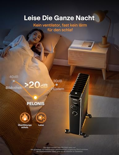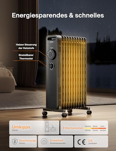 PELONIS Ölradiator 2300W mit J-förmigen Lamellen, Ölgefüllter Heizkörper mit 3 Heizstufen & Thermostat, Leiser Elektroheizer mit Kippschutz, Energieeffizient A für Schlafzimmer, Wohnzimmer, Büro