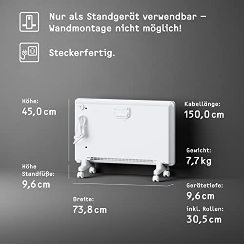 AUSSTATTUNG: Leistungsstarke, flache Elekroheizung mit hoher Heizleistung; Langlebiger Edelstahl-Rohrheizkörper mit Stahllamellen nicht rostend; Mit beleuchtetem Ein-/Aus-Schalter; Der Standkonvektor ist mit dem Prüfzeichen TÜV Süd ausgestattet und erfüllt damit alle relevanten TÜV Anforderungen