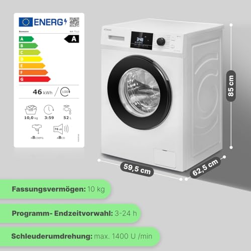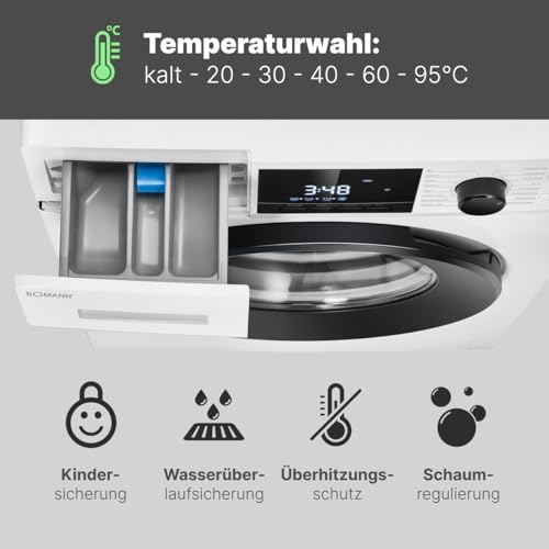 Bomann® Waschmaschine 10kg | max. 1400 U/min | 16 Programme | Bürstenloser DC-Motor: effizient, leise und langlebig | Endzeitvorwahl | Zulaufschlauch-Sicherheitssystem | Washing Machine | WA 7111
