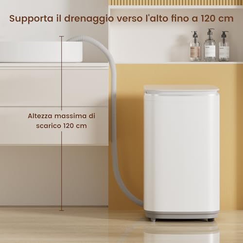 【Ablaufpumpe】 Die HAVA T02 Kleine Waschmaschine ist mit einer integrierten Ablaufpumpe ausgestattet, die eine maximale Ablaufhöhe von bis zu 120 cm ermöglicht. Dieses Design erhöht die Flexibilität bei der Installation erheblich und ist besonders praktisch in beengten Räumen oder an Standorten ohne Bodenablauf.
