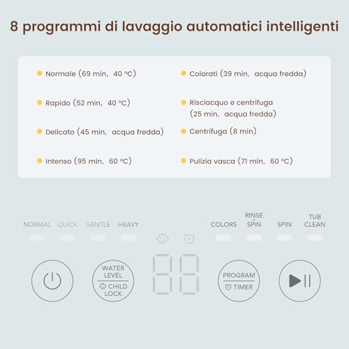 【Heißwaschoptionen】 Diese T02 Mini Waschmaschine verbessert die Reinigungsleistung, indem sie das Wasser in häufig genutzten Programmen auf 40 °C oder 60 °C erhitzt. So löst sie selbst hartnäckige Flecken leicht, eliminiert Bakterien und Allergene. Für die meisten pflegeleichten Textilien geeignet, sorgt diese Funktion für die Hygiene-Bedürfnisse Ihrer Familie.
