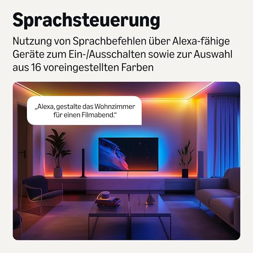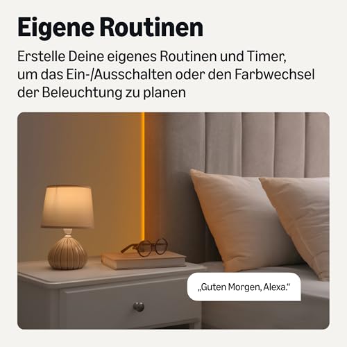 Intelligente Aktualisierung: Smart Light Strips können mit der Stimme oder über die Alexa App gesteuert werden. Erstelle benutzerdefinierte Routinen, um deine Beleuchtung automatisch bei Sonnenuntergang und -aufgang ein- oder auszuschalten ODER ändere die Farben deiner Beleuchtung für Filmabende oder Partys. Funktioniert ausschließlich mit Alexa. Nicht kompatibel mit Google Assistant, Apple HomeKit, Smart Things