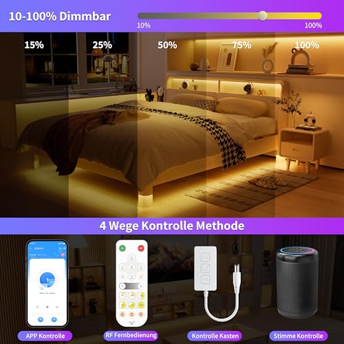 Umfangreiche Funktionen: Unterstützt mehrere Steuerungs methoden! Integrierte dynamische und statische Modi können die Anforderungen mehrerer Szenarien erfüllen.Verwenden Sie die Steuerbox,um die Helligkeit umzuschalten und anzupassen. Verwenden Sie sogar die mobile APP, Sprach- oder RF-Fernbedienung, um die Licht bänder aus jedem Winkel zu steuern (Reichweite der Fernbedienung: innerhalb von 15m im offenen Bereich). Verfügt über verschiedene Funktionen wie Dimmen,Timer, Musikmodus, Speicher Funktion und Gruppen Steuerung.