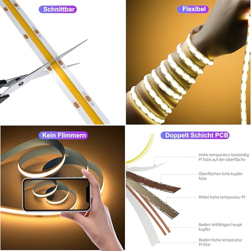 Schneidbar und Selbstgemacht: Die flexiblen COB LED Licht bänder von OULARA können alle 50mm entlang der Schnitt markierungen auf dem Streifen geschnitten werden und die Streifen an diesen Schnitt markierungen durch Löten oder mithilfe von 8mm COB Steckern wieder verbinden (suchen Sie nach B0D69KLXYH).Wird mit Selbstklebemittel geliefert und kann direkt auf jeder trockenen,ebenen Oberfläche angebracht werden,ohne dass komplizierte Werkzeuge oder Spezialkenntnisse erforderlich sind.