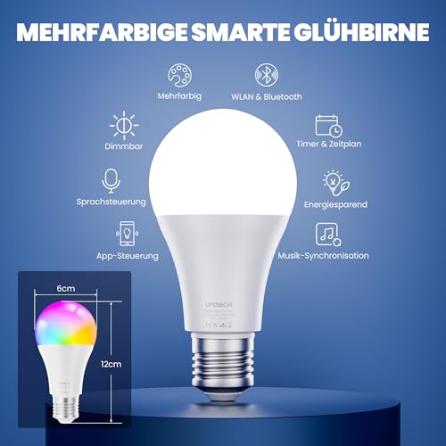 Smarte Steuerung – Aktivieren Sie 2,4GHz WLAN und Bluetooth für den vollen Funktionsumfang. Mit der Smart Life App steuern Sie Ihre smarte Glühbirne jederzeit und von überall: Ein- und Ausschalten, Helligkeit anpassen, Farben wechseln oder Lichtszenen festlegen.