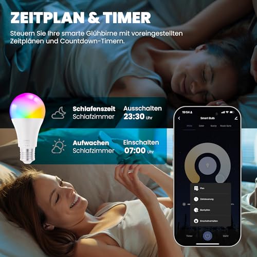 Sprachsteuerung – Steuern Sie Ihre smarte E27-Glühbirne ganz einfach per Sprachbefehl über Alexa oder Google Assistant. Sagen Sie z. B. „Alexa, dimme das Schlafzimmerlicht“. Ideal, um das Licht auszuschalten, ohne aufzustehen.