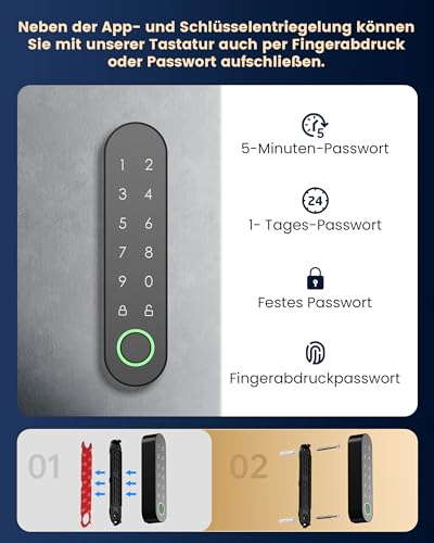 Bequeme Installation: Das Türschloss elektrisch wird ohne Bohren über vorhandene Türschlösser installiert, sodass Ihr aktueller Schließmechanismus erhalten bleibt. Das Tastenfeld kann mit Schrauben oder Klebeband befestigt werden. Hinweis: Das Türschloss mit Fingerabdruck wird auf der Innenseite montiert, während das Tastenfeld auf der Außenseite installiert wird.