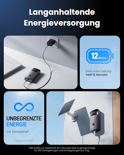 [Ultralonger Akkulaufzeit und Solaraufladung – nur einmal pro Jahr laden] Mit einer eingebauten 5000mAh-Batterie und Radar-Awoken-Technologie unterstützt es eine bis zu 12-monatige Nutzung; mit einem Solarladegerät ermöglicht es unter Sonneneinstrahlung eine unbegrenzte Nutzung, umweltfreundlich und ohne die Mühe häufiger Batteriewechsel.