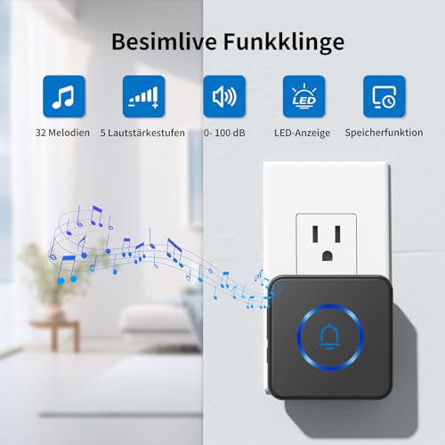 Funkklingel, BESIMLIVE Türklingel Funk Set, Kabellose Türklingel, 32 Melodien auf 5 Stufen Volumes mit LED Anzeige(Schwarz -1 Packung)