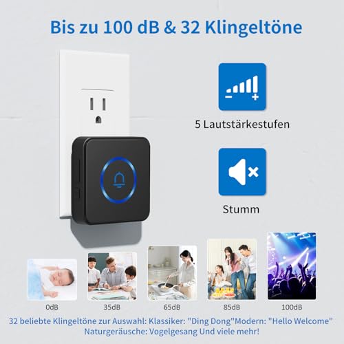 【5 Tonstufen & 32Verschidene klngeltone】Der klingel haustür bietet satten und klaren Klang. Es gibt 5 Tonstufen zur Auswahl verschiedener Töne(0 dB bis 100 dB). Die kabellose Türklingel verfügt über 32 Glocken Ihren Bedürfnissen gerecht zu werden. Dieses erstaunliche funkklinge set ist ideal für Eltern, Senioren und laute Haushalte!