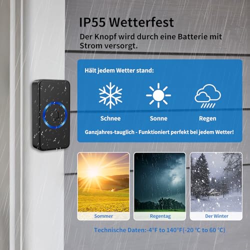 【 IP55 staubdicht und wasserdicht 】 Dieser Türklingel mit IP55-Schutzklasse ist robust für jedes Klima und trotzt Regen, Schnee und extremen Temperaturen von -20 °C bis 60 °C. Keine Wettersorgen mehr – er funktioniert das ganze Jahr über perfekt bei Stürmen, Staub und sengender Hitze.