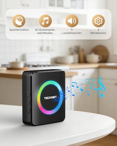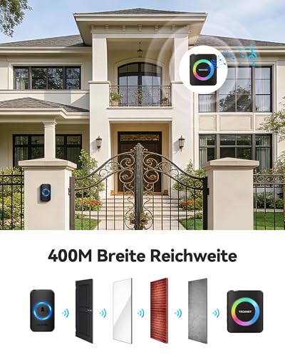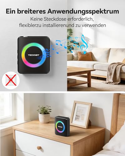 TECKNET Funkklingel Batteriebetrieben, Mini kabelloses Türklingel 400M, IP66 Aussen Wasserdicht Funk klingel Set, 5 Lautstärkestufen Haustür Klingel, und 60 Melodien doorbell Mit RGB-Anzeige
