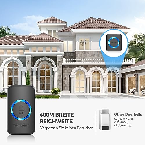 TECKNET Funkklingel, IP65 Funk klingel Set Aussen Wasserdicht, Kabellose Türklingel 400m Reichweite, Haustür Klingel kit mit 1 Plug-In-Empfänger und 1 Sender, 60 Melodien doorbell Mit LED-Blitz