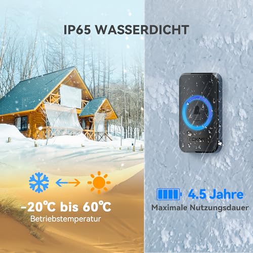 【IP65-wasserdichter Türklingel】Das Klingel-Set verwendet eine CR2032-Lithium-Batterie für den Klingelknopf, die aufgrund ihres extrem niedrigen Stromverbrauchs eine Lebensdauer von bis zu 4,5 Jahren hat. Funk klingel funktioniert zwischen -20°C und 60°C und kann verschiedenen rauen Wetterbedingungen standhalten.