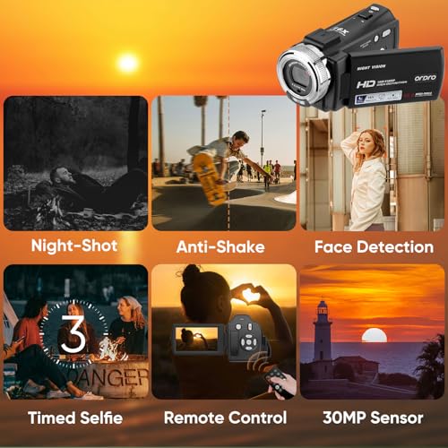 ORDRO V12 Videokamera 1080P IR Nachtsicht Vlogging Kamera für YouTube, 16X Zoom Digitalkamera mit Mini-Stativ, Fernbedienung und 2 Batterien