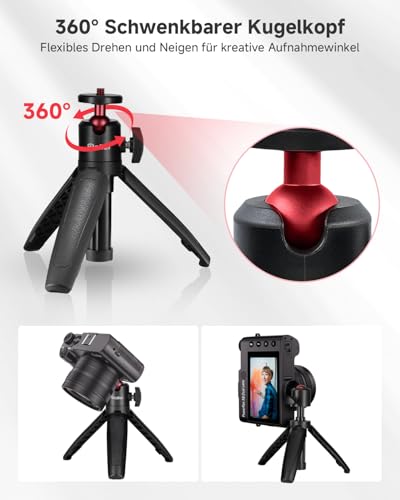 【360° Kugelkopf】Das robuste Tischstativ mit 360° flexiblem Kugelkopf(Max. Traglast 1,5kg) kann für Panorama-, Vertika-Aufnahmen verwendet werden und kann in jedem Winkel frei gedreht werden, um die ideale kreative Perspektive zu finden. Ideal für blogger und youtuber