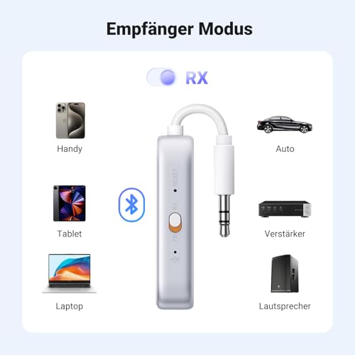 2 in1 Bluetooth Sender/Receiver: Im TX-Modus können Sie das Gerät mit einem Fernseher, Flugzeug oder anderen Geräten ohne Bluetooth-Funktion verbinden und anschließend Bluetooth Kopfhörer zum Musikhören anschließen. Im RX-Modus verwandeln Sie Stereoanlagen ohne Bluetooth-Funktion, wie z. B. Autoradios oder ältere Lautsprecher, in Bluetooth-Geräte und können anschließend Mobiltelefone, Computer usw. zum Musikhören verbinden