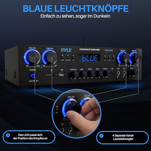 Pyle Amplifier, 800W Bluetooth Verstärker – 4-Kanal Mini Amp mit MP3, USB, AUX, SD, Mikrofon, FM, RCA, Reverb/Delay – Stereo für Heimkino, Studio & Theater