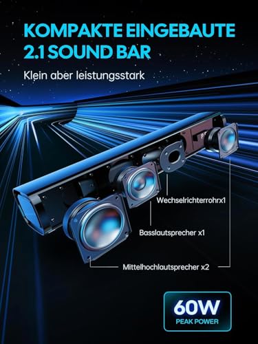 Kompakte 2.1-Soundbar mit integriertem Subwoofer (bis zu 60 W) Kraftvoller Sound und spürbar mehr Bass in einem kompakten Format – ideal für TV, PC und Gaming. Für eine stabile Tonwiedergabe über Optisch/AUX empfehlen wir: TV-Audioausgabe auf PCM (Stereo) einstellen.