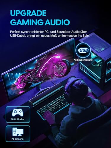 USB-Audio für PC & Laptop – Plug & Play Direkte USB-Audioübertragung für PCs und Laptops – perfekt für den Schreibtisch. Im GAME-EQ Modus wirken Effekte und Details intensiver. Hinweis: Einige TVs und Spielkonsolen geben Audio nicht über USB aus – in diesem Fall bitte Optisch oder AUX vom TV nutzen.