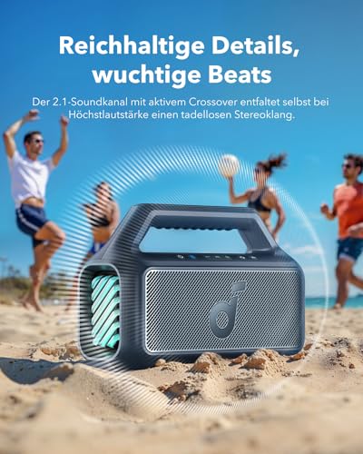 soundcore by Anker, Boom 2 Outdoor-Lautsprecher, 80W, Subwoofer, BassUp 2.0, 24h Akku, IPX7 Wasserdicht & Schwimmt, LED-Licht, USB-C, EQ, BT 5.3, Mobiler Bluetooth-Speaker, Camping, Strand, Garten