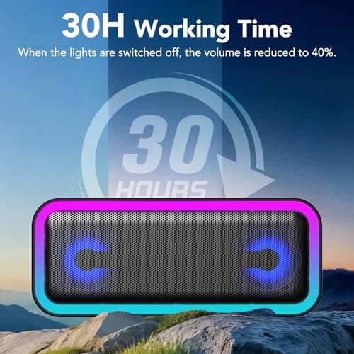 5. 30 Stunden Akkulaufzeit – Der Speaker hat einen 4000-mAh-Akku für bis zu 30 Stunden Spielzeit (bei 40 % Lautstärke ohne Licht). Per Knopfdruck lassen sich die RGB-Lichter ausschalten, um die Akkulaufzeit zu verlängern. So begleitet Sie dieser Bluetooth Lautsprecher Klein und kraftvoll durch jedes Wochenende.