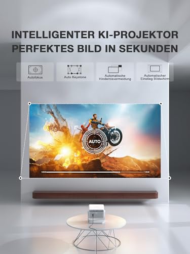 [3-in-1-Technologie, vollautomatische Projektion] Dieser revolutionäre smart Projektor vereint drei Kerntechnologien – Autofokus, Automatische Trapezkorrektur und KI-Hindernisvermeidung – und bietet so ein ultimatives „Plug-and-Play”-Erlebnis. Ausgestattet mit dem bahnbrechenden AutoFocus 2.0-System, kann er in nur 3 Sekunden eine präzise Fokussierung im Bereich von 0,05 mm erreichen. In Kombination mit der automatischen Trapezkorrektur mit einem Winkel von ±60° sorgt er für eine perfekte Bildkalibrierung aus jedem Blickwinkel, sodass Sie jederzeit und überall ein flüssiges Film- und Spielerlebnis genießen und sofort ein professionelles audiovisuelles Erlebnis schaffen können.