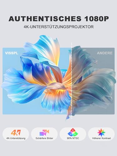 [Ultra-HD Großbildprojektion für cineastisches Erlebnis] Der VISSPL Beamer klein hat eine Projektionsgröße von 40 -250 Zoll, bietet eine native Auflösung von 1080p, unterstützt 4K-Anzeige, HDR10 und 99% NTSC-Farbraum (entspricht ~130% sRGB), verbessert die Farbgleichmäßigkeit um 75 % und verfügt über eine 120Hz MEMC (Motion Estimation and Motion Compensation), die Bewegungsunschärfen im Millisekundenbereich beseitigt und stets eine scharfe Bildqualität in 4K-HD gewährleistet. 1600ANSI hoher Helligkeit ist das Bild auch im Freien hochauflösend, sodass Sie jedes Bild in vollen Zügen genießen können.