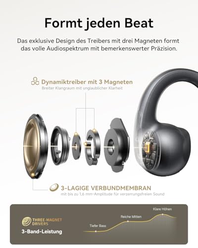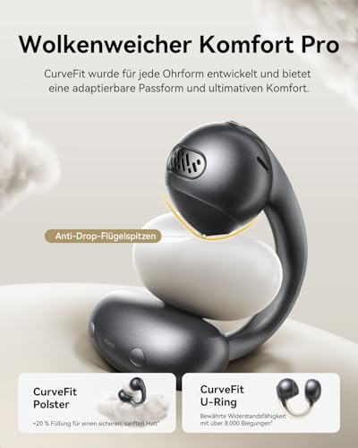 – Ganztägiger Clip-On-Tragekomfort: Die Clip-Ohrhörer mit offenem Ring verfügen über ultraweiche, elastische CurveFit-Polster, Anti-Drop-Flügelspitzen und einen flexiblen U-Ring aus TPU und mit über 8.000 Biegungen getesteten Memory-Titandraht. Diese nur 5 g schweren, offenen Ohrhörer bieten atmungsaktiven, adaptierbaren, sicheren Sitz mit wolkenähnlichem Komfort für verschiedene Ohrformen, ohne zu reizen oder zu drücken