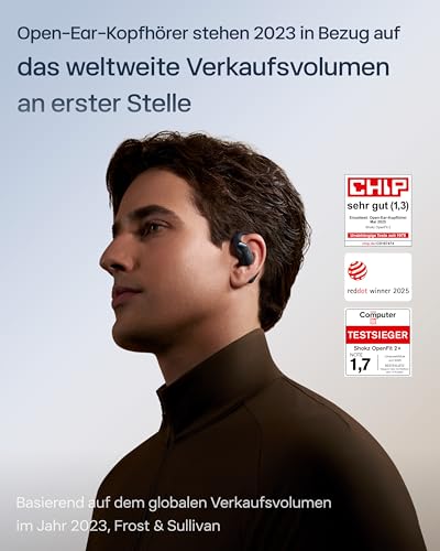 SHOKZ OpenFit 2+ Neu Open-Ear-Kopfhörer, Dolby Audio Ohrbügel-Ohrhörer, 48 Std. Spielzeit, IP55 wasserfeste Bluetooth-Ohrhörer mit Mik., kabelloses Laden, USB-C-Schnellladen, mit Tragetasche, Schwarz