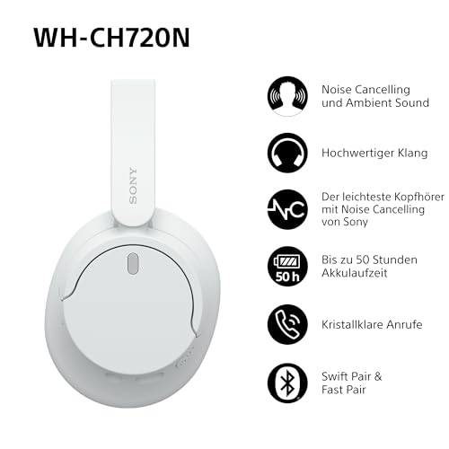 Sony WH-CH720N Kabelloser Bluetooth-Kopfhörer mit Noise Cancelling – bis zu 35 Stunden Akkulaufzeit und Schnellladefunktion – Weiß