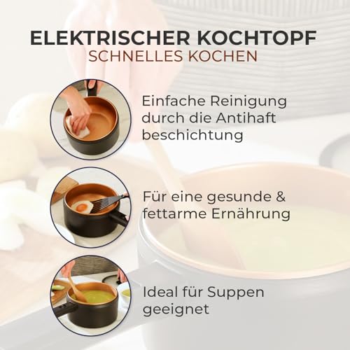 GESUND UND BEQUEM: Mit der innovativen Antihaft-Keramikbeschichtung des elektrischen Kochtopfs sparen Sie nicht nur Zeit, sondern auch Kalorien. Das Einfetten wird überflüssig, was die Zubereitung von gesunden, fettarmen Gerichten ermöglicht. Die Beschichtung sorgt zudem dafür, dass der Topf leicht zu reinigen ist – einfach auswischen, und schon ist er bereit für den nächsten Einsatz. Ihre Gesundheit steht im Vordergrund, und gleichzeitig genießen Sie den Komfort einer einfachen Handhabung