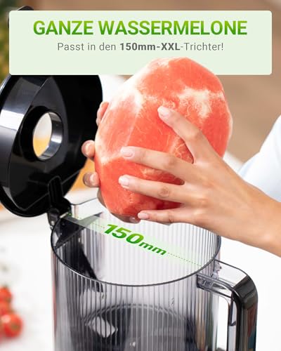 GANZE FRÜCHTE REIN – OHNE VORBEREITUNG! Dank 150mm XXL-Trichter (bisher größter Haushalts-Entsafter) sparen Sie 15 Minuten Schneidezeit: Werfen Sie ganze Bio-Äpfel, Ingwerknollen oder Mini-Wassermelonen (Ø 15cm) direkt hinein – perfekt für entzündungshemmenden Ingwer-Shot! Kein Schneidbrett, kein Messer, keine Sauerei.