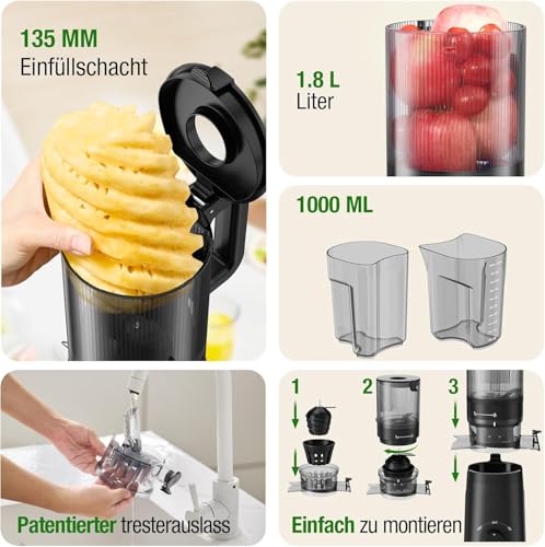 TUUMIIST Entsafter‚ Slow Juicer mit 135MM Extra Großem Einfüllschacht, Entsafter Gemüse und Obst Testsieger anwendbar Ganzes Obst und Gemüse, Leicht zu Reinigen, Hohe Saftausbeute, BPA-Frei, Schwarz