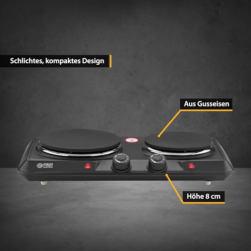 TZS First Austria Doppelkochplatte 2500 W | Gusseisen-Kochfelder 180/150 mm | Manuelle Steuerung | Metallgehäuse | mobil für Camping & Reisen