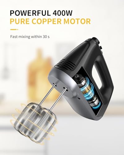 🍰【400 W leiserer Motor】Profitieren Sie von dem eingebauten Kupfermotor, dieser elektrische Handmixer kann kraftvolles Mischen mit geringem Rauschen realisieren.Große Belüftung sorgt für schnelle Wärmeableitung. Wenn Sie Fragen zum Handrührgerät haben, kontaktieren Sie uns bitte jederzeit, wir bieten Ihnen die beste Lösung.