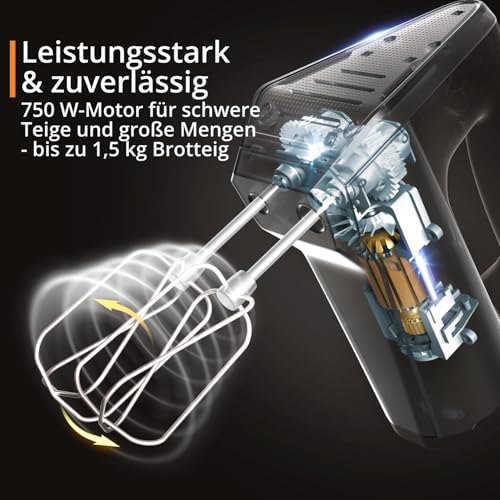 Mühelose und gleichmäßige Resultate: Dank leistungsstarkem 750 W-Motor und robusten Metallteilen werden selbst schwere Teige und große Mengen problemlos verarbeitet