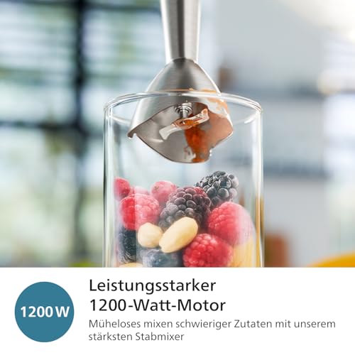 Leistungsstarkes Mixen: Mit 1200 Watt reiner Zerkleinerungsleistung püriert der Philips 5000-Serie Stabmixer mühelos selbst die schwierigsten Zutaten für schnelle und effiziente Ergebnisse