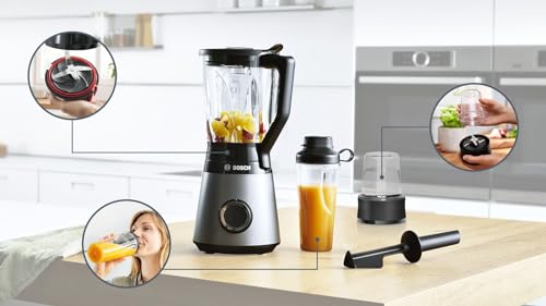 Bosch Standmixer, Smoothie Maker, 30,000 U/min, 1200 W, Edelstahl-Messer, 1,5l ThermoSafe Glasbehälter, 0,6l ToGo-Flasche, Zerkleinerer, Made in Europe, VitaPower Serie 4 MMB6177S