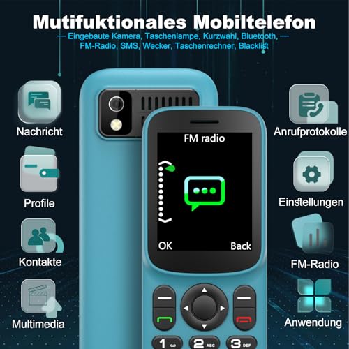 📱【Multifunktionales und sparsames 4G Handy】Das bedienfreundliche handy ohne internet speichert bis zu 200 Kontakte und bietet: integrierte Kamera, Taschenlampe, Wecker, Kalender, Taschenrechner, MP3/MP4-Player, FM-Radio und erweiterbaren Speicher (bis zu 32 GB SD-Karte). Unterstützt 7 Sprachen: Englisch, Deutsch, Französisch, Spanisch, Italienisch, Portugiesisch und Niederländisch.