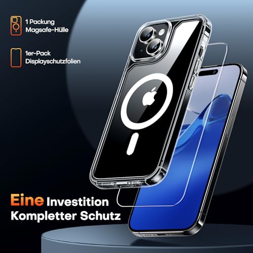 TAURI für iPhone 15 Hülle 6,1″ mit Panzer Schutz Glas Folie, Kompatibel mit MagSafe, Schutz nach Militärstandard, [Anti-Vergilbung] Stoßfest Magnetisch Handyhülle – Durchsichtig