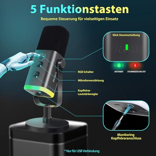 [USB-Anschluss und Mehrzwecktasten] Das Podcast-Mikrofon kann direkt über ein USB-Kabel an einen Computer (Mac/Windows) angeschlossen werden . Das PC-Mikrofon verfügt über eine LED-Stummschalttaste, mit der Sie schnell stummschalten können. Der Gain-Regler ermöglicht eine Echtzeitanpassung der Lautstärke, ohne dass eine Computersteuerung erforderlich ist. Das USB-Mikrofon verfügt auch über einen Kopfhöreranschluss für Echtzeitüberwachung. (Nur für USB-Verbindung geeignet)