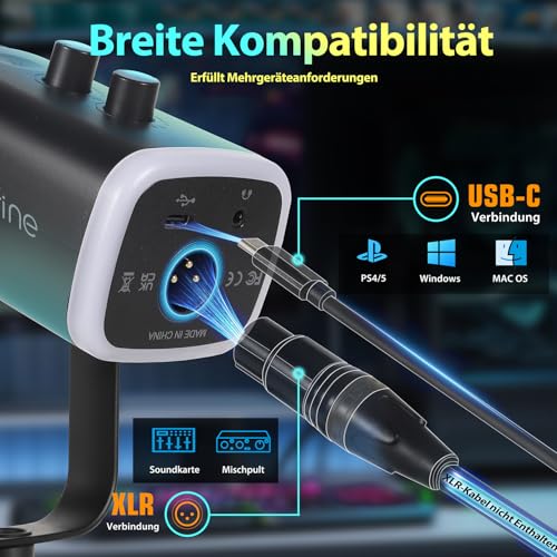 Bitte beachten Sie: Ein USB-A-zu-USB-C-Datenkabel ist im Lieferumfang enthalten, das XLR-Datenkabel ist nicht im Lieferumfang enthalten. Kompatibel mit PC/Laptop (Windows/Mac), PS4/5, nicht kompatibel mit Ipad, Handy, Xbox; kann Soundkarte oder Mixer über XLR-Datenkabel anschließen.