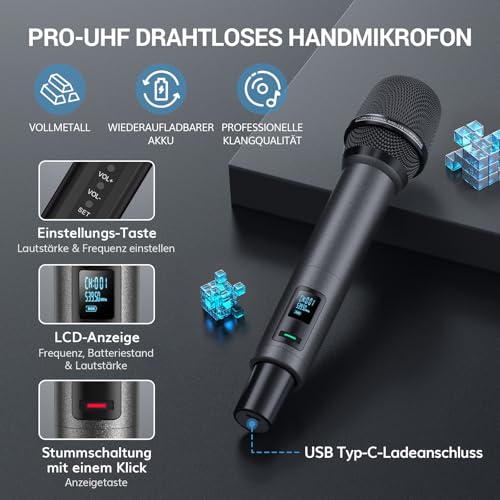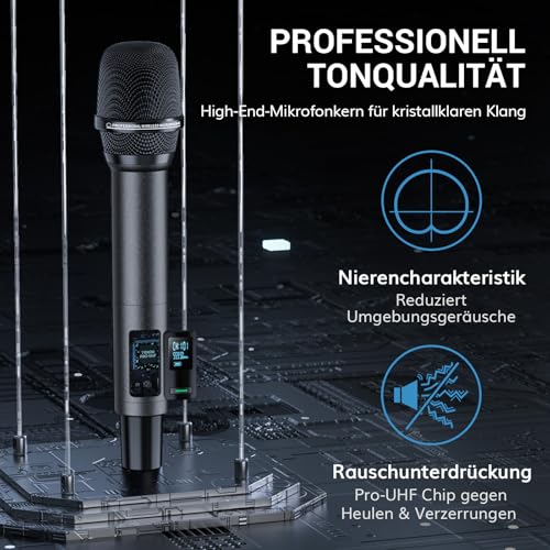 Hervorragende Klangqualität: Das Wireless Microphone verfügt über einen dynamischen High-End-Mikrofonkern mit Nierencharakteristik, der eine klare und authentische Klangqualität gewährleistet; unterstützt Audiogeräte mit 6,35 mm/3,5 mm-Anschlüssen. Ideal für Karaoke, Kirche, Hochzeiten, Auftritte, Reden usw.