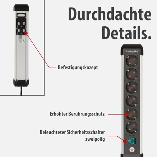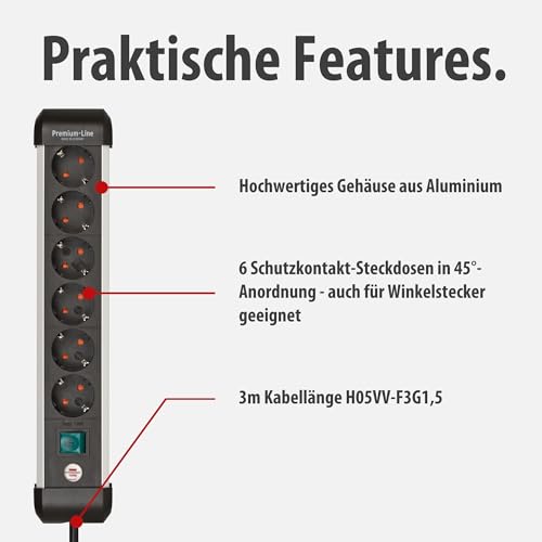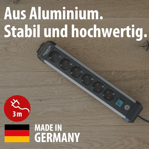 Brennenstuhl Premium-Alu-Line Steckdosenleiste 6-Fach/Steckerleiste aus hochwertigem Aluminium (Mehrfachsteckdose mit Schalter und 3m Kabel, Made in Germany)