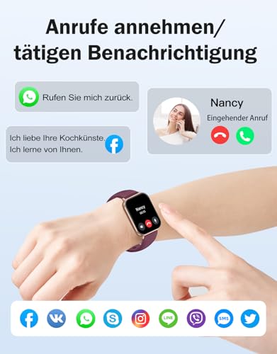 Intelligente Benachrichtigung und weitere praktische Tools Die Smartwatch vibriert und erinnert Sie an Nachrichten von Twitter, WhatsApp, Facebook, Instagram und mehr, damit Sie auch unterwegs in bleiben können. Sie verfügt über zahlreiche praktische Tools, darunter Kamera /Musiksteuerung, Timer, Wecker, Bewegungserinnerung, Wetter, Atemübungen, Helligkeitsanpassung usw., die alle Ihre täglichen Bedürfnisse erfüllen.